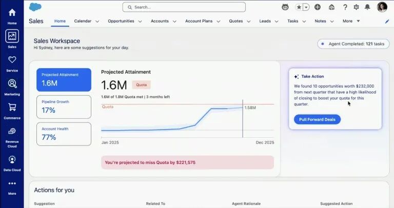 延续 “效能倍增” 这一主题,在 Agentforce Sales领域,业务容量不再是增长的限制。在销售主题演讲(可通过 Salesforce + 或 YouTube 点播收看)中,全新的 “销售工作空间”(Sales Workspace)正式亮相 , 这一功能为销售人员打造了类似 “指挥中心” 的使用体验,旨在改变他们的工作方式。