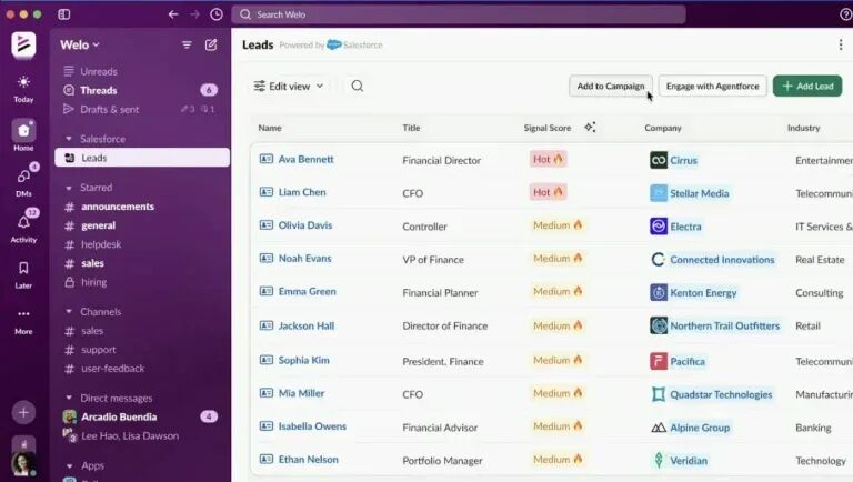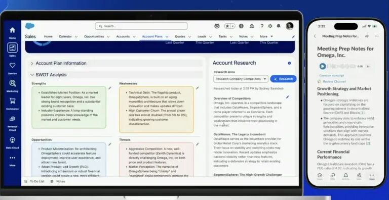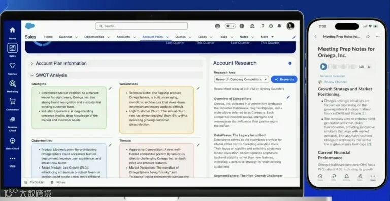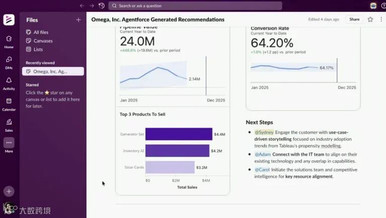 通过将Slack与Salesforce深度融合,Agentforce Sales可直达销售团队的协作场景。不仅如此,即使在交易达成后,Agentforce 仍能提供支持,自动生成包含后续工作步骤的建议,同时还会推荐可进一步推销的产品,助力团队延续与客户的沟通互动。