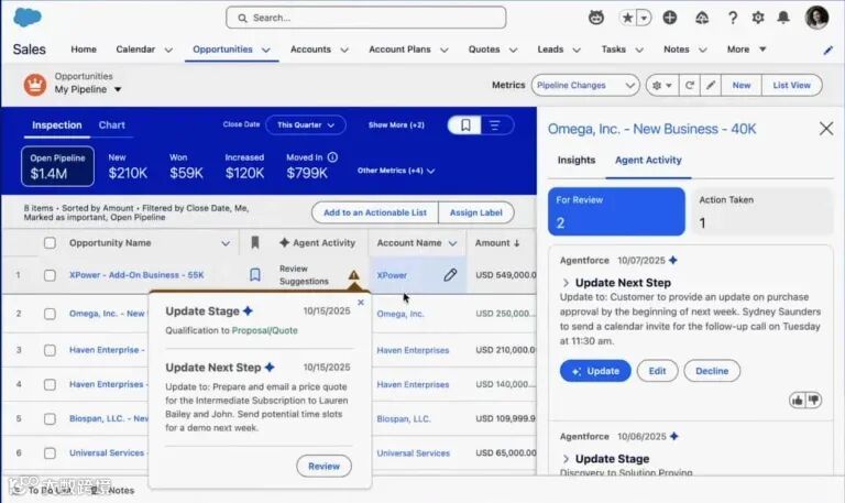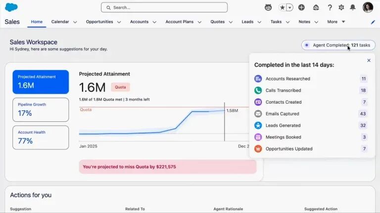 除了顶部嵌入的 Tableau 数据仪表盘和商机推荐功能外,Agentforce 还会生成一份 “需人工介入的操作清单”。此外,用户还能一目了然地查看智能代理在销售周期内所有关键环节已完成的全部任务。