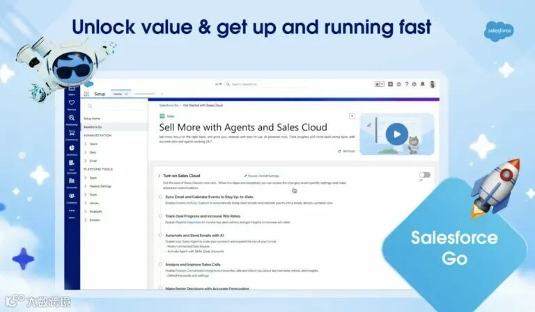 此前推出的 “Sales Cloud Go”现已升级为 “Salesforce Go”,它将成为您了解、启用和监控所在组织内关键功能的首选平台。虽然该模块并非专为 Agentforce Sales设计,但其中包含的功能与功能集已覆盖销售主题演讲中展示的大部分功能,且目前已可使用。