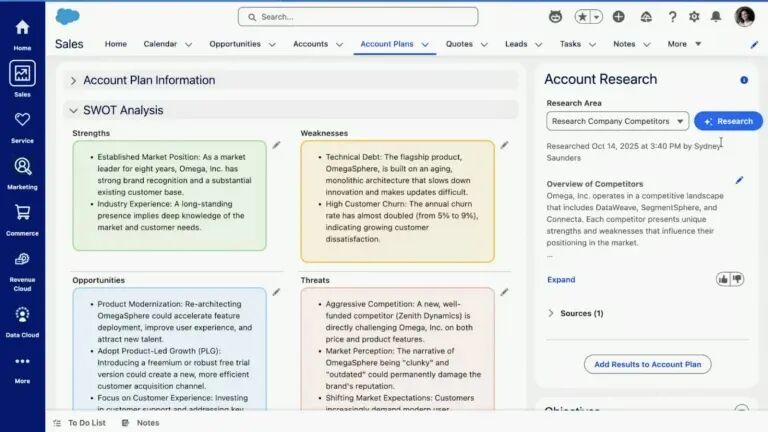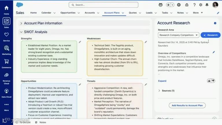 其中一项是"客户调研"功能,该功能最初在Dreamforce '24大会上作为路线图规划首次发布,如今随Winter '26版本正式亮相。从客户计划出发,系统可对多个领域进行调研,并能一键轻松更新客户计划。所有这些客户情报也将同步至Slack平台,因此您的团队可以轻松获得急需的见解。