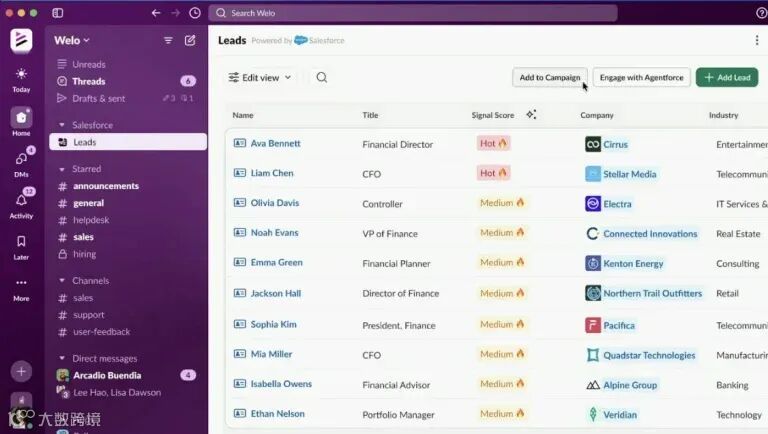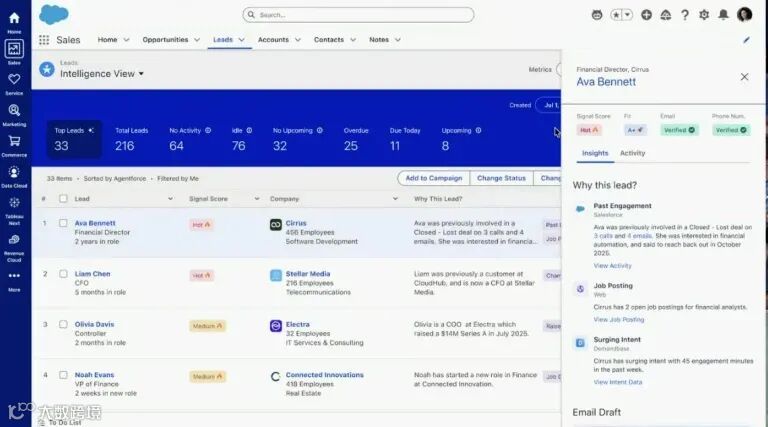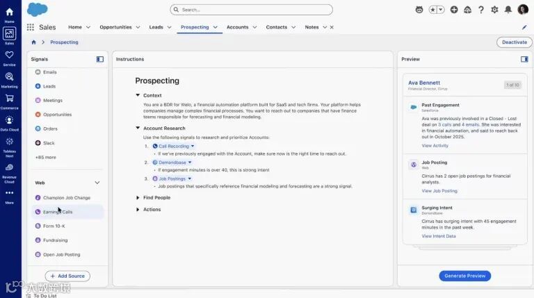 Agentforce将通过自动分析历史活动记录、客户互动数据及意向信号,彻底改变传统耗时的优先级排序流程,为团队筛选出最值得跟进的优质线索。最关键的是,系统分析的数据来源十分灵活,既可以是 Salesforce 平台内的数据,也能整合来自其他多个渠道的信息。