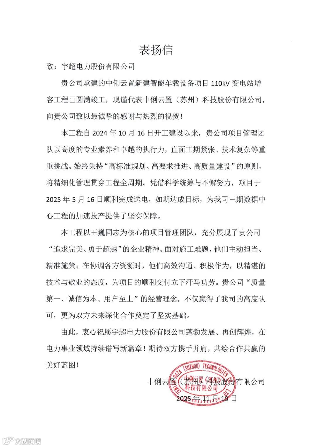 2025年11月,宇超电力股份有限公司(以下简称"宇超股份")收到了从中俐云置(苏州)科技有限公司送来的表扬信,对宇超股份承接的中俐云置(苏州)科技有限公司(朝亚数据中心)新建智能车载设备项目110kV变电站增容工程项目顺利投运表示感谢与祝贺。