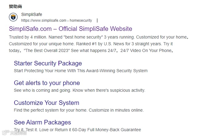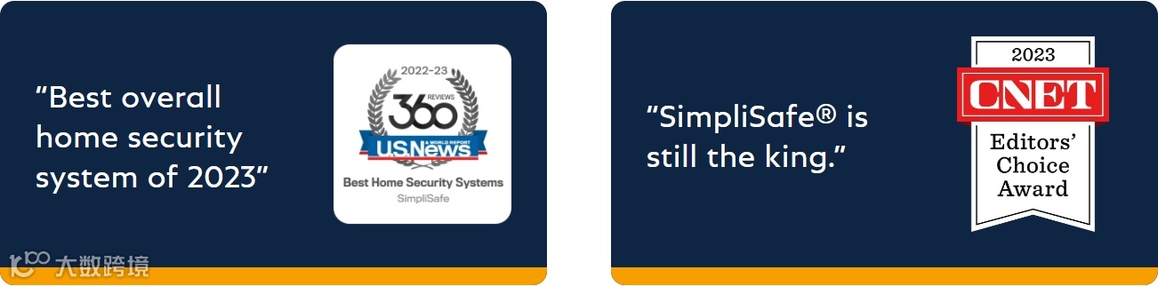 SimpliSafe在广告中,一再重申自己所获得的荣誉,包括“best home security 3 years running”、“The Best Overall 2023”,这实际上是通过强调品牌的信誉和认可度,来强化专业和高品质的品牌形象,从而获得消费者信任,进而促进消费者点击甚至购买。