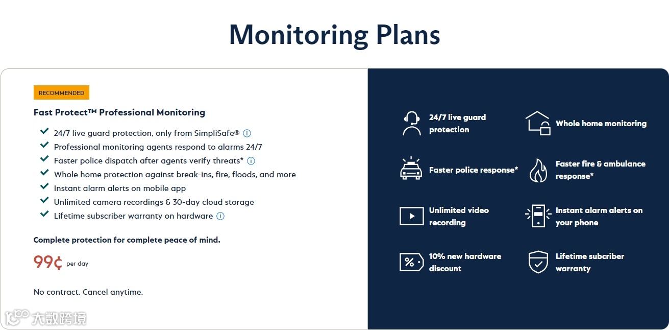 SimpliSafe推出的增值套餐,提供7*24小时代为监控服务,是能够帮助消费者解决这一难题,从而对转化产生积极影响的。此外,由于是月付套餐,需要持续付费,所以也能为其带来长期收入,同时增强用户粘性。