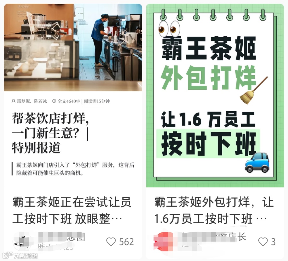 近日,据媒体报道,霸王茶姬委托外部服务商派人上门帮工打烊,第二天早班员工只需要拍照验收服务。这个项目在霸王茶姬内部被称为“夜洁计划”,“夜洁”即“夜间清洁”。