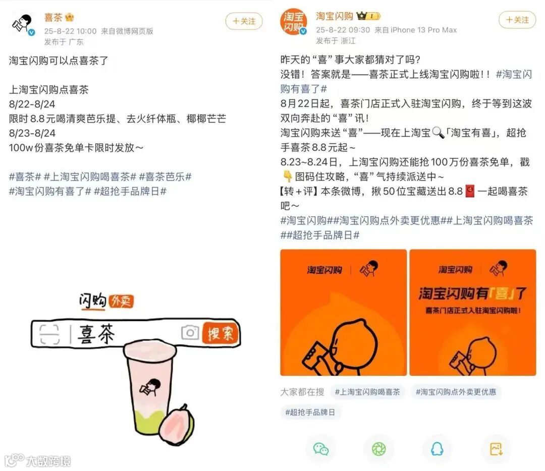 8月22日,喜茶全国超4000家门店全量上线淘宝闪购(饿了么)。据介绍,喜茶还同步上线了淘宝闪购“超抢手”频道,并对清爽芭乐提、去火纤体瓶等明星单品推出限时惊喜价。8月23日-24日,双方还共同发放100万份喜茶免单卡。