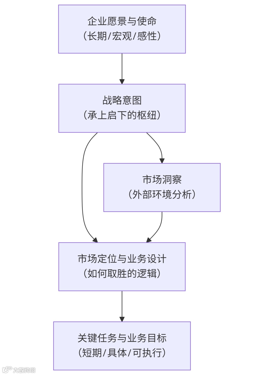 它源于并具体化了企业的愿景与使命。愿景是“成为智能世界的引领者”,战略意图则将其转化为“三年内进入全球前五”的具体目标。 - 启下: