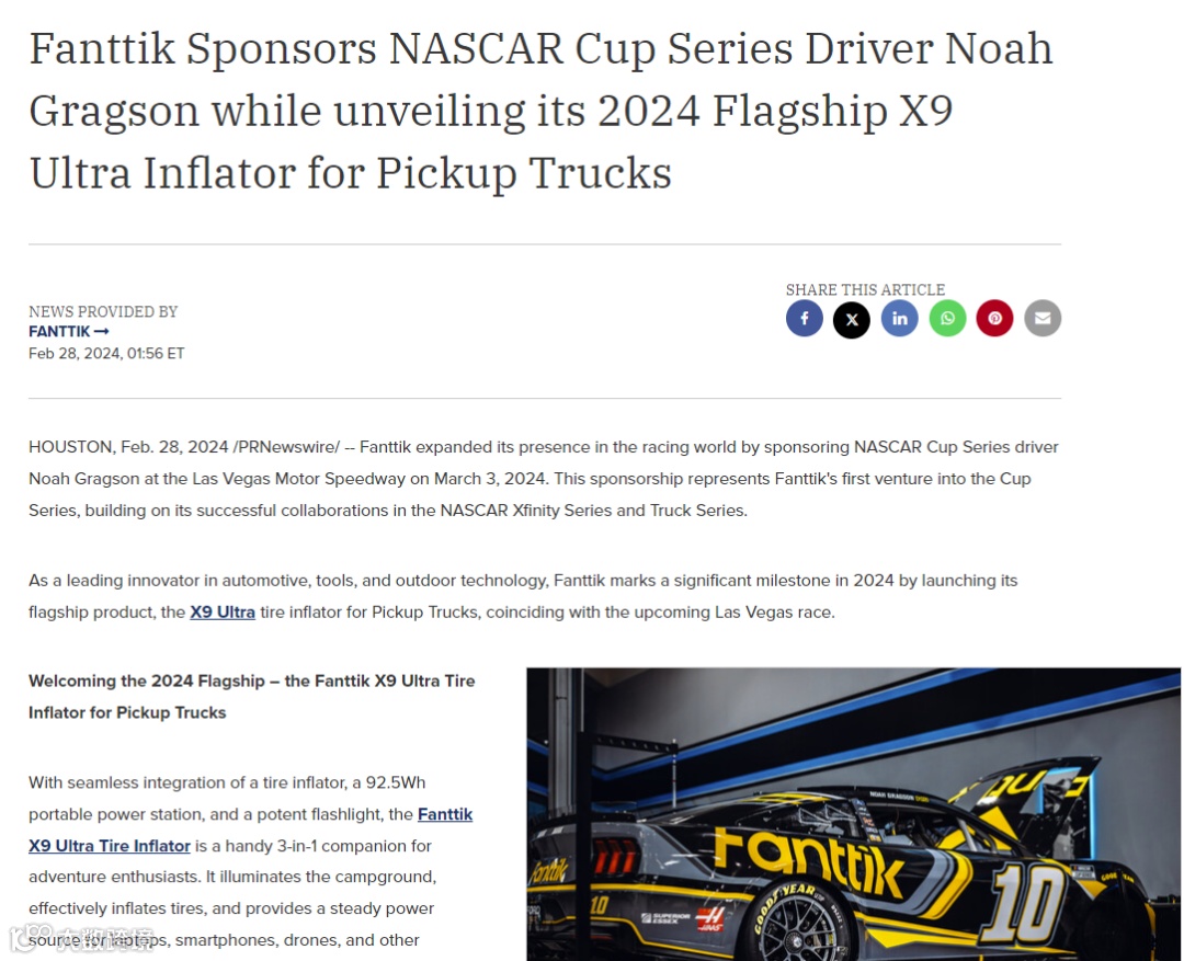在赞助赛事场外,Fanttik通过发布全球通稿进行赞助宣发,借助赛事知名度迅速拉升品牌影响力。2023年,Fanttik作为独家赞助商携手Kyle Weatherman赛车手的稿件上线。2024年,Fanttik赞助NASCAR杯系列赛车手Noah Gragson的稿件先于开赛前发布,提前预热夺关注。