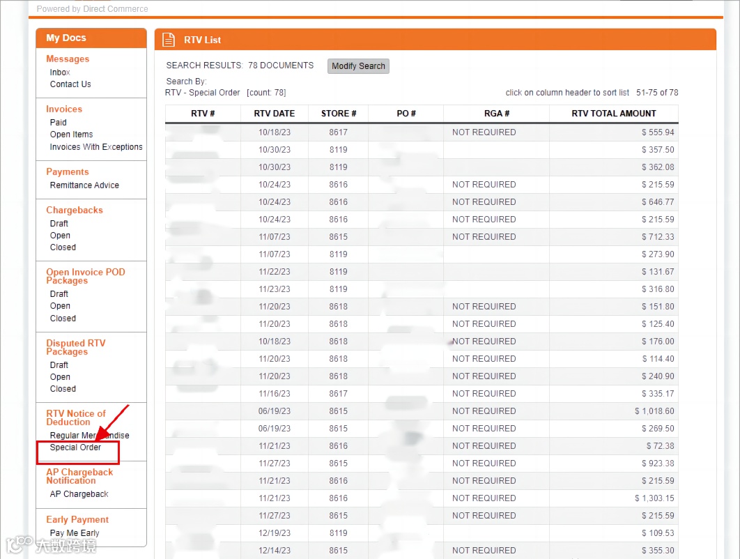 选择Merch Payables Self-Service Portal US ONLY - Supplier User在查看RTV Notice of Deduction- Special Order。