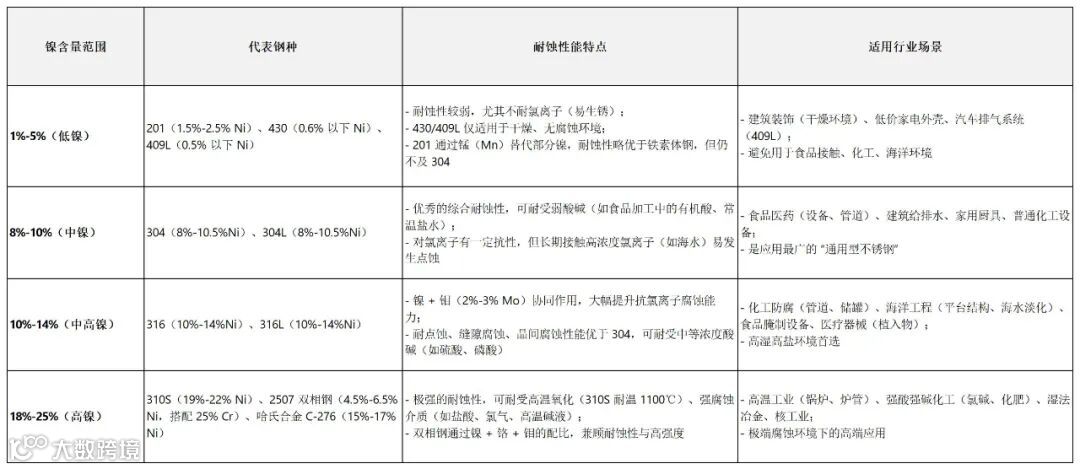 低镍(1%-5%):低成本、低性能,仅适用于简单装饰、干燥环境;