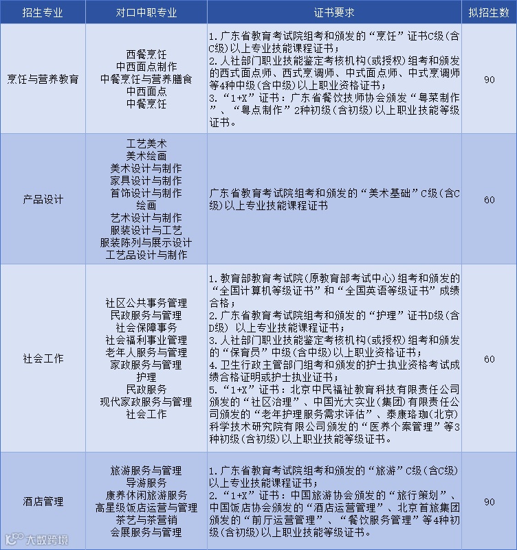 “1+X”证书:由广东省餐饮技师协会组织评价的粤菜制作职业技能等级证书、粤点制作职业技能等级证书按以下等级对应方式计入:高级等级证书对应45分,中级等级证书对应36分,初级等级证书对应27分。