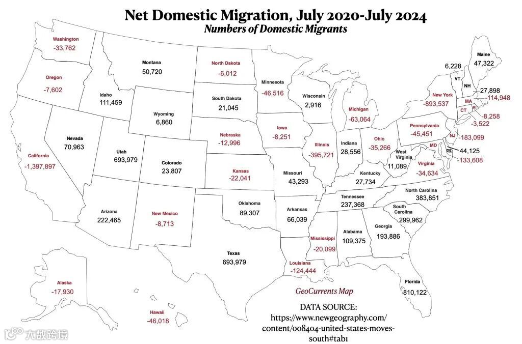 2020年-2024年美国各州人口迁移情况。图片显示,2020年-2024年主要蓝州人口持续流出,主要红州人口持续流入。来源:newgeography