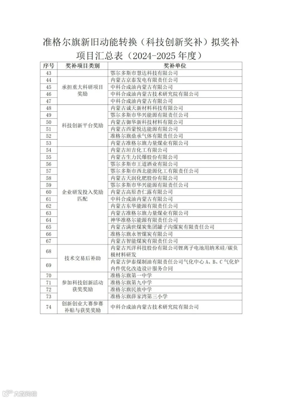 按照《准格尔旗新旧动能转换(科技创新奖补)资金管理办法》(准政办发〔2021〕97号)《准格尔旗新旧动能转换(科技创新奖补)资金管理办法实施细则》(准政办发〔2021〕98号)及《准格尔旗工信和科技局关于征集2024-2025年度新旧动能转换(科技创新奖补)项目的通知》(准工科联发〔2025〕25号),经材料审核、专家评审和旗人民政府第13次常务会审定,现将准格尔旗新旧动能转换(科技创新奖补)奖补项目名单予以公示,公示期为2025年11月26日—12月2日。