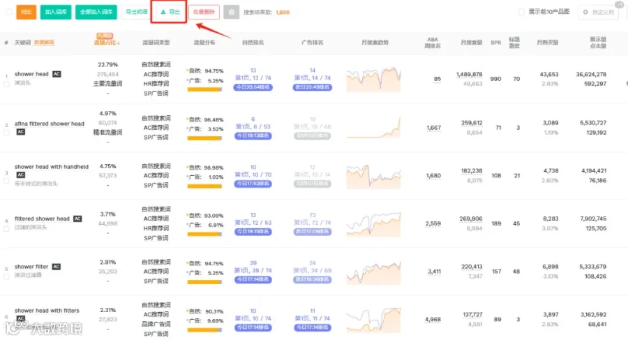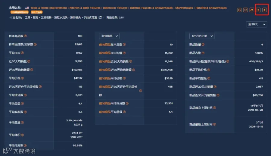 通过卖家精灵工具,我们可以下载到美国站Handheld Showerheads(手持式花洒)市场分析报告,如图所示(右上角下载):