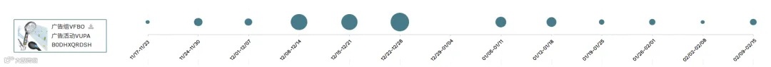圆点表示不同时间段的广告搜索词数量,圆点越大表示搜索词越多,点击圆点可以看到搜索词详情。搜索词详情具体包含广告搜索词、搜索该关键词时展示的ASIN、关键词的SP广告排名、自然排名等数据。
