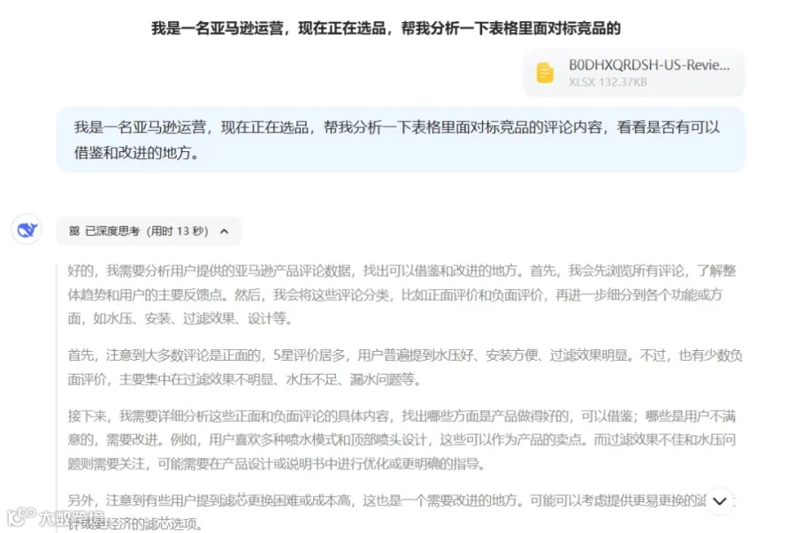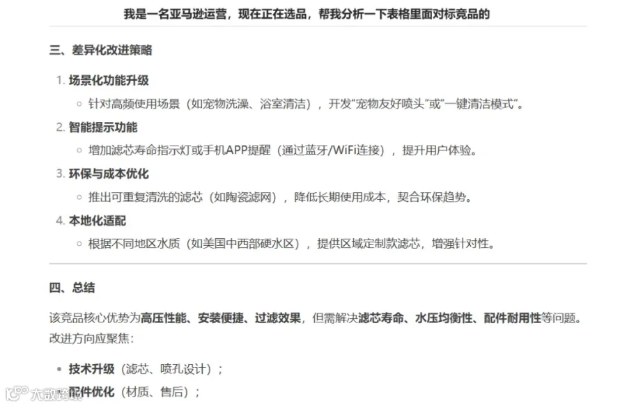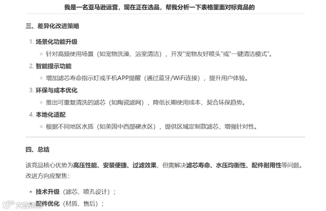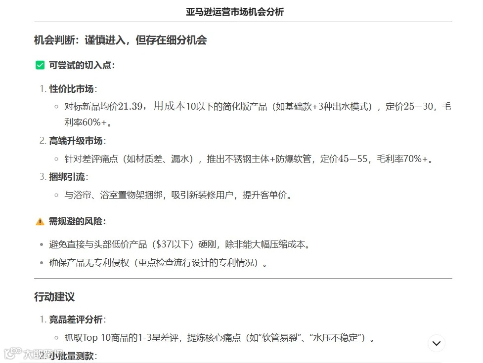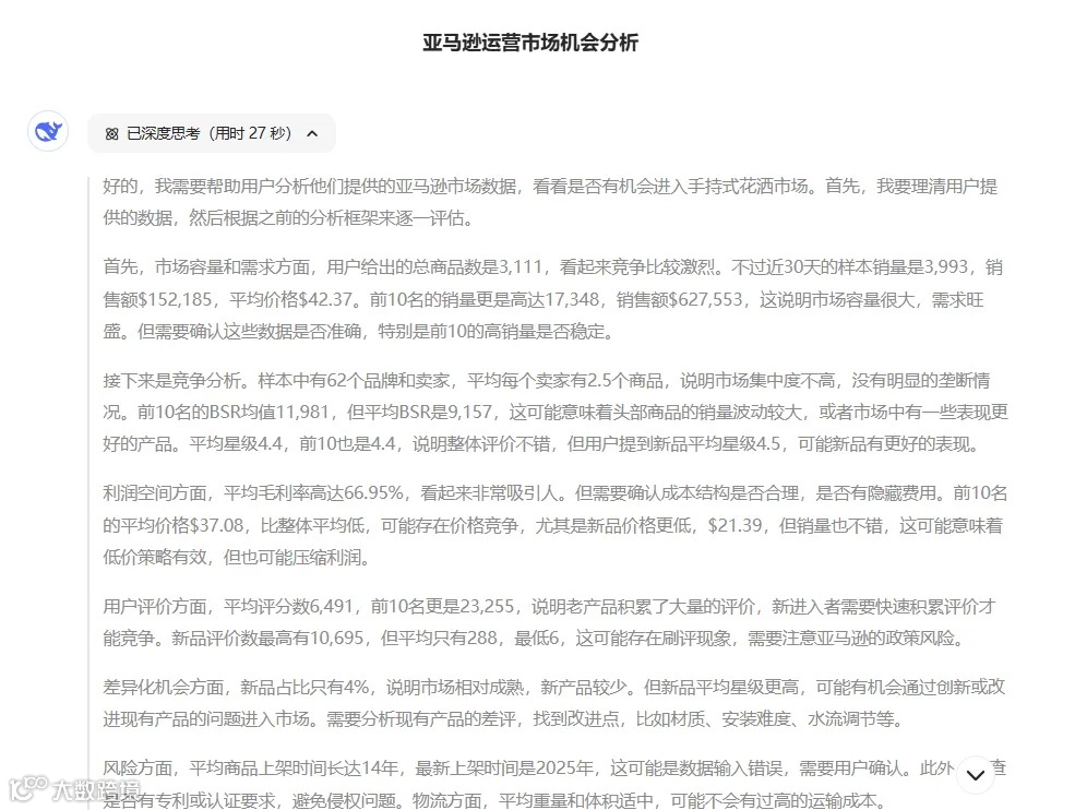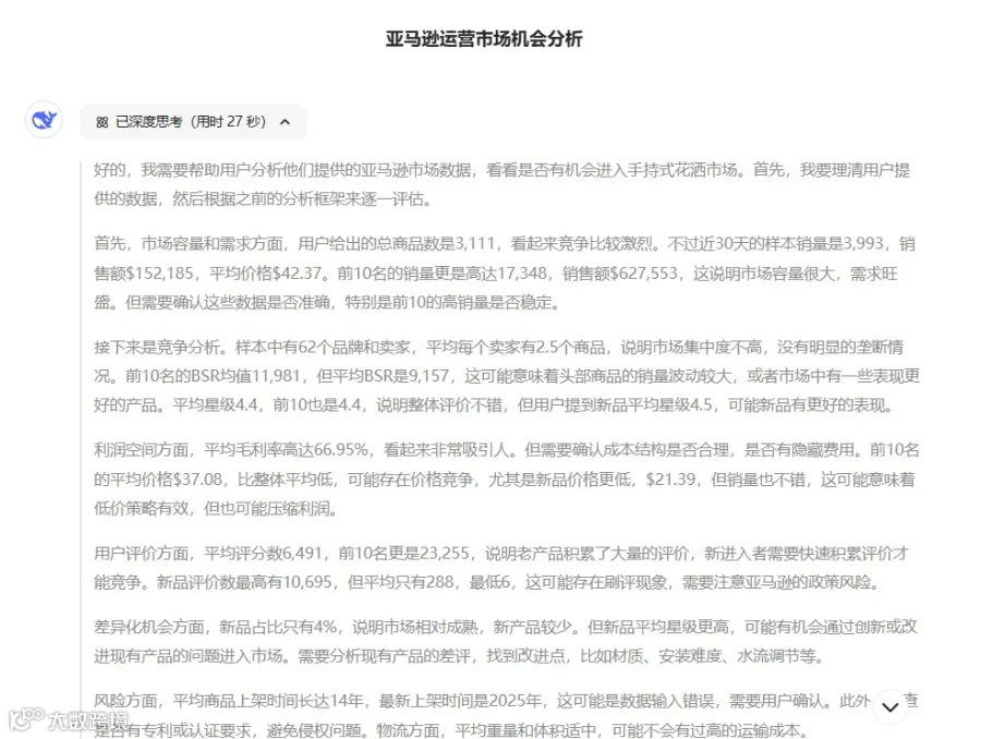 我们可以把以上报告的内容复制到DeepSeek,或者直接把下载好的文档导入DeepSeek,让它帮我们分析市场,看看新品是否有机会进入市场。输入指令:我是一名亚马逊运营,帮我分析一下以下数据,看看是否有机会进入市场。以下是DeepSeek回答的部分截图: