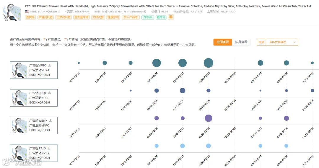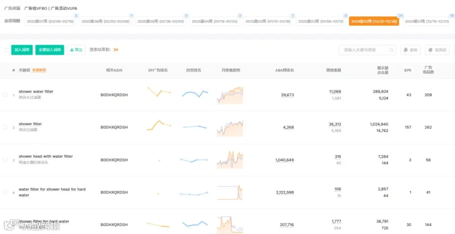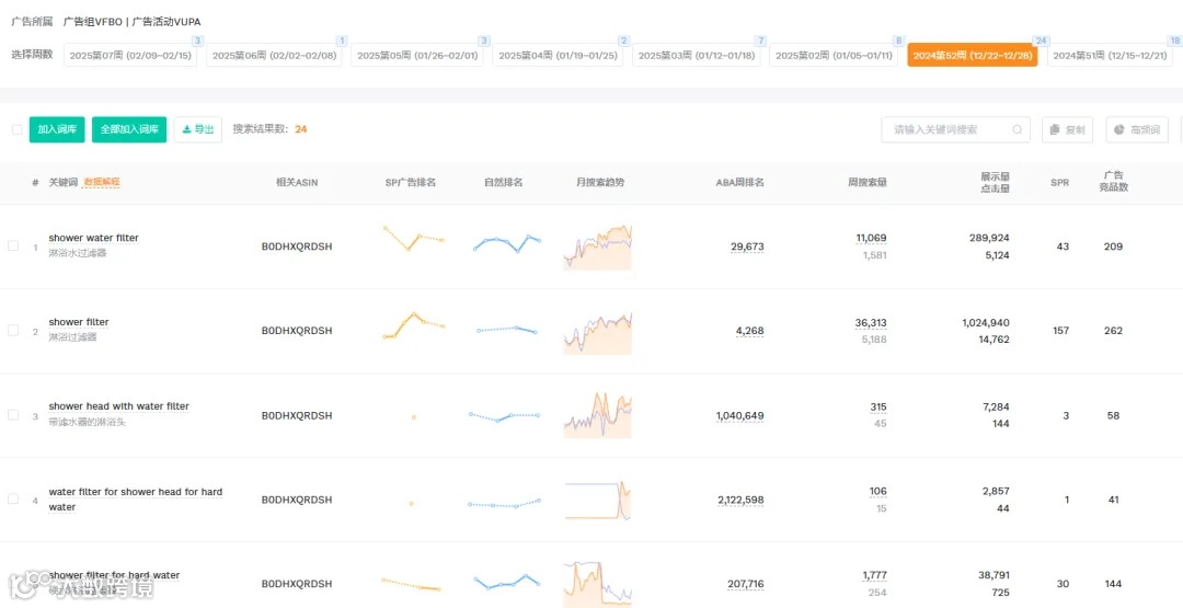 分析:由上图可见,这几周的搜索词数量较多,波动明显,推测可能是自动广告。我们点击2024第52周 (12/22~12/28)这一周的广告,发现这组有24个搜索词,搜索词较分散,没有明确的词根和规律性。从搜索词的释义上来看,与沐浴花洒的相关度较高,推测是自动广告的紧密匹配。自动广告可以带来比较大的流量,有助于跑词,检测listing质量,筛选出单关键词。