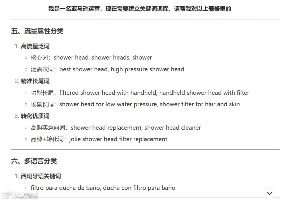 亚马逊运营如何搭建关键词词库?可以结合卖家精灵+DeepSeek的功能,用卖家精灵反查竞品关键词,然后批量下载,再让DeepSeek进行关键词分类,搭建关键词词库。