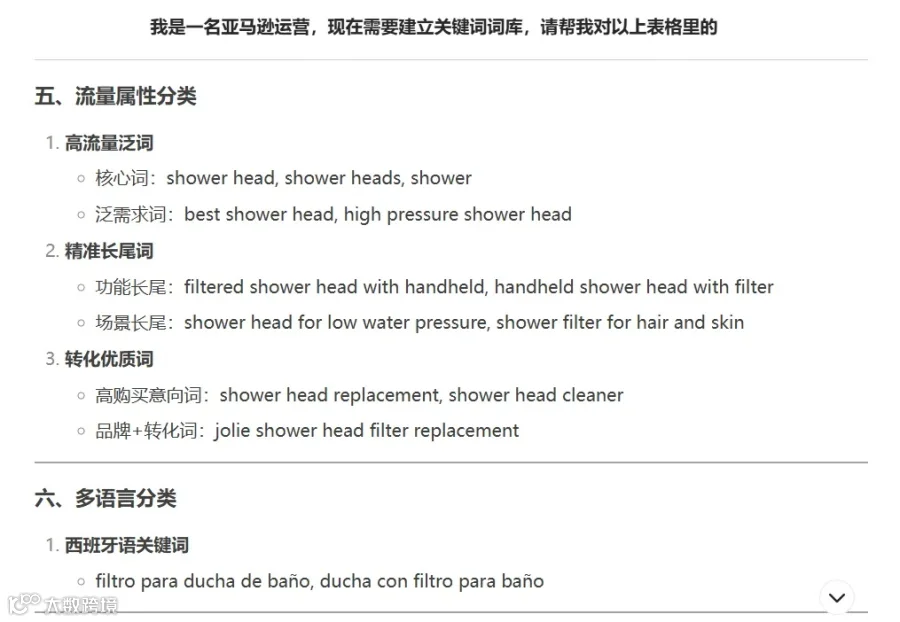 通过卖家精灵工具,只有输入产品ASIN,就可以反查到该产品一共有1606个关键词,还可以批量导出关键词,然后把表格导入Deepseek,让它帮我们进行分类,建立关键词词库。