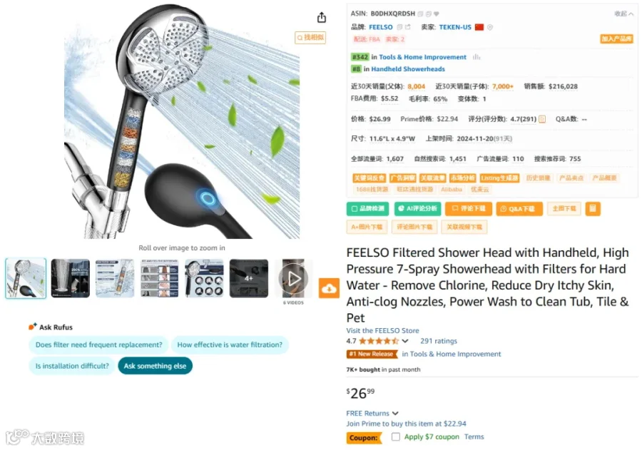 亚马逊选品调研案例分析:一款沐浴花洒,新品上架3个月,最近30天销量8004单,平均每天出266.8单,每单利润71.14元,每天利润18980.15元,每月利润569404.56元,这到底是怎么做到的?