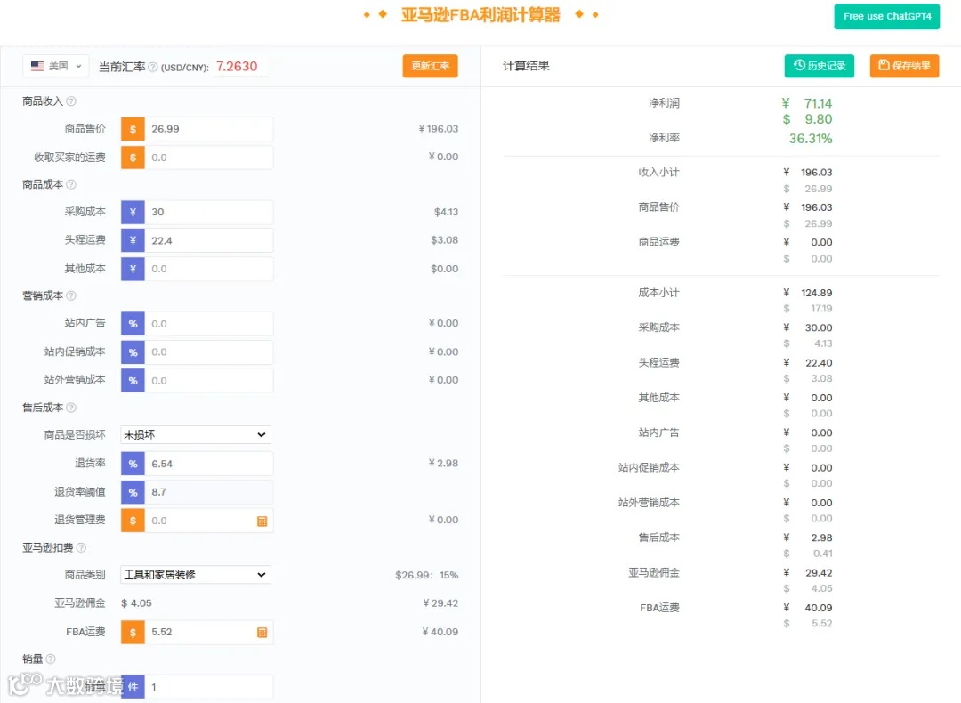 成本30元,售价26.99美金,佣金4.05,FBA运费5.52美金,头程运费大概22.4元一件,当前汇率7.263,退货率6.54%,新品的广告费暂时未算。