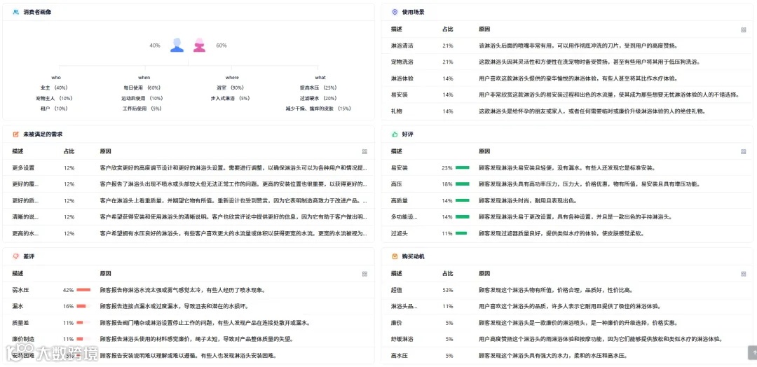 分析产品的评论对选品和产品开发有重要的意义,通过卖家精灵的AI评论分析功能,我们可以看到这款花洒的消费者画像,使用场景,未被满足的需求,好评,差评和购买动机等等。