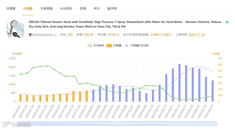 通过卖家精灵工具,我们可以看到这款花洒2024年11月20日上架,目前大类排名342,小类目排名8,2025年2月开始销量飙升,2月14日那天销量最高,一天就出了616单。