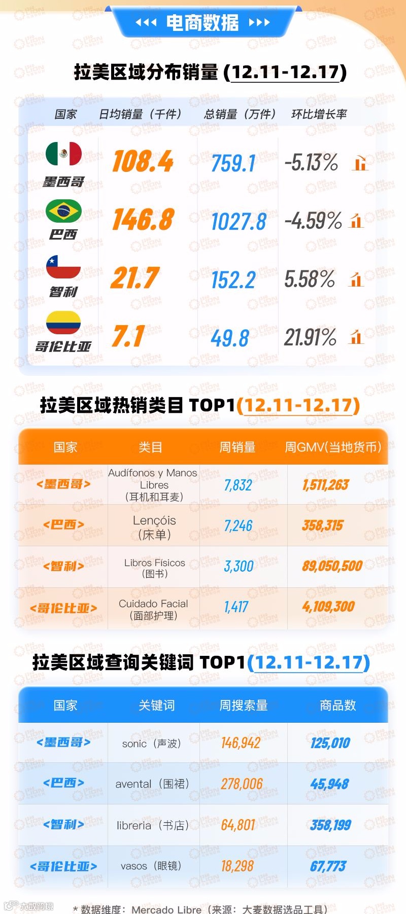 墨西哥3C类商品连续两周销售量居于最高,3C类商品中手机电话的品牌集中度较高且进入有一定难度,鉴于3C商品在拉美的热度,可以适当的选择像耳机、数据线等之类的电子配件。巴西站点家居装饰类商品床单销量上周达到最高,智利站点图书销量居于首位,这与即将到来的圣诞节密切相关,圣诞节前拉美人都会精心的装饰房间,精心为朋友准备各种礼物等。墨西哥上周热搜词为sonic,相关商品数为12万;巴西站点连续两周热搜词为围裙,且其热搜量和商品数都有所增长;智利站点热搜词为书店,其相关商品数约为36万,此商品类目中相关商品量也是比较庞大的,进入需要提前了解此赛道;总体来说,本周墨西哥、巴西站点呈现下降趋势,智利、哥伦比亚站点销量呈现上涨趋势。