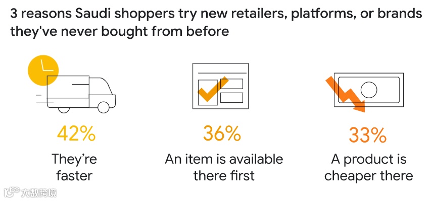 并且,42%的沙特消费者表示,如果产品发货更快,他们将尝试新品牌、零售商或平台。同时,如果产品更便宜,则有33%的人愿意尝试这样做。