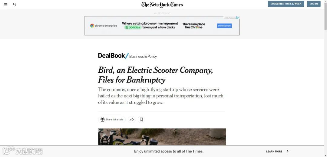 12月21日消息,美国电动滑板车巨头Bird已于当地时间周三申请破产保护。该公司是美国有史以来最快达成“独角兽”价值的初创企业,巅峰时期市值一度达到25亿美元