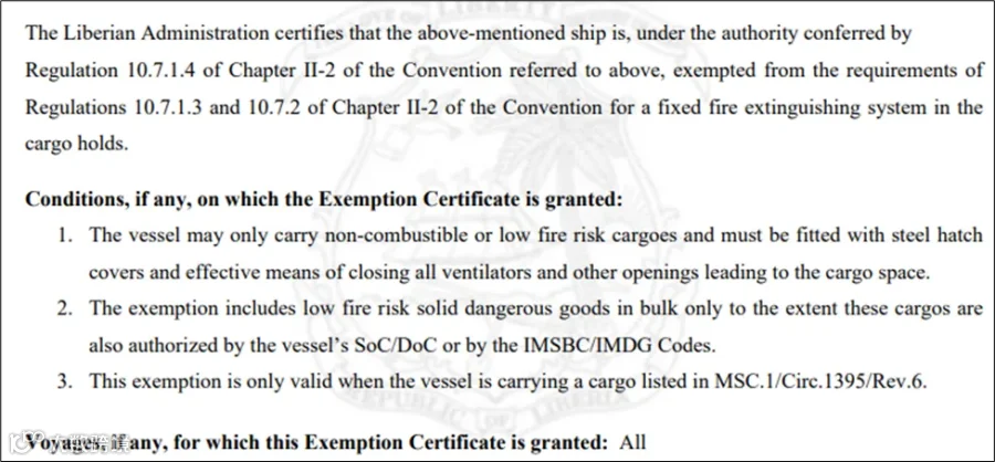 在特定情况下,如所载固体散装货物不受SOLAS第II-2/10条关于货舱内安装固定CO2或惰性气体灭火系统规定约束时,可签发相应免除证书[k]。