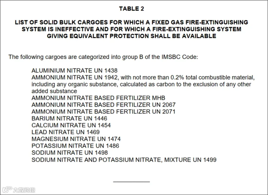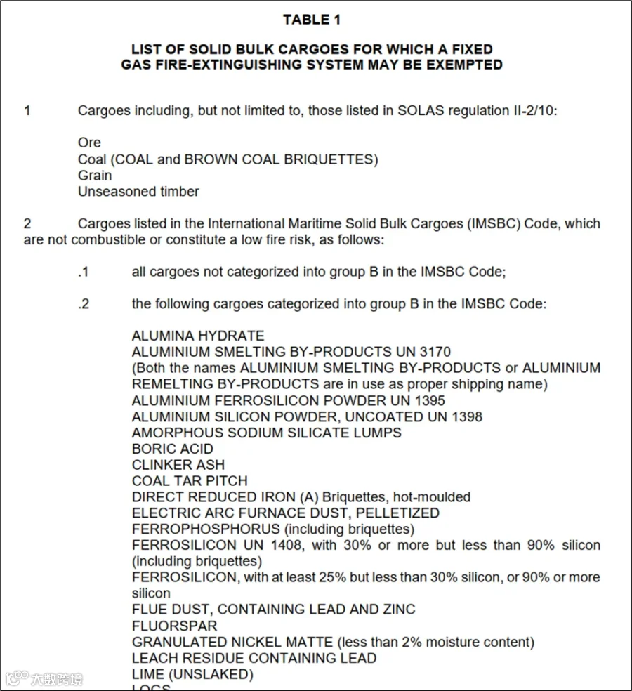 国际海事组织(IMO)通过MSC.1/Circ.1395发布标准通告,列明可免除安装二氧化碳装置的固体散装货物清单(Table 1),同时包含固定气体灭火系统无效但需提供同等保护的货物清单(Table 2)[k]。