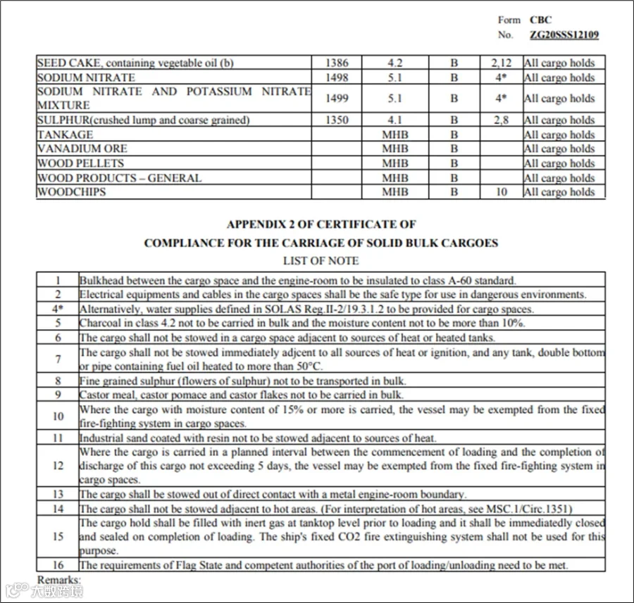 船舶在满足IMSBC规则、SOLAS公约、装载手册及稳性资料等相关要求后,由船级社签发《固体散装货物适装证书》(COC for Carriage of Solid Bulk Cargoes),明确允许装载的货物种类[k]。