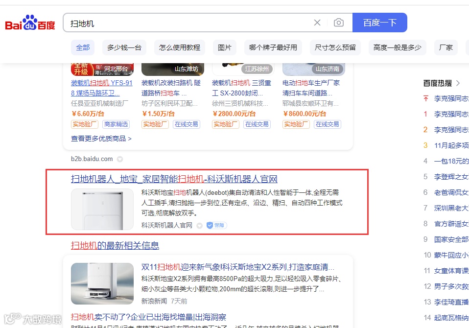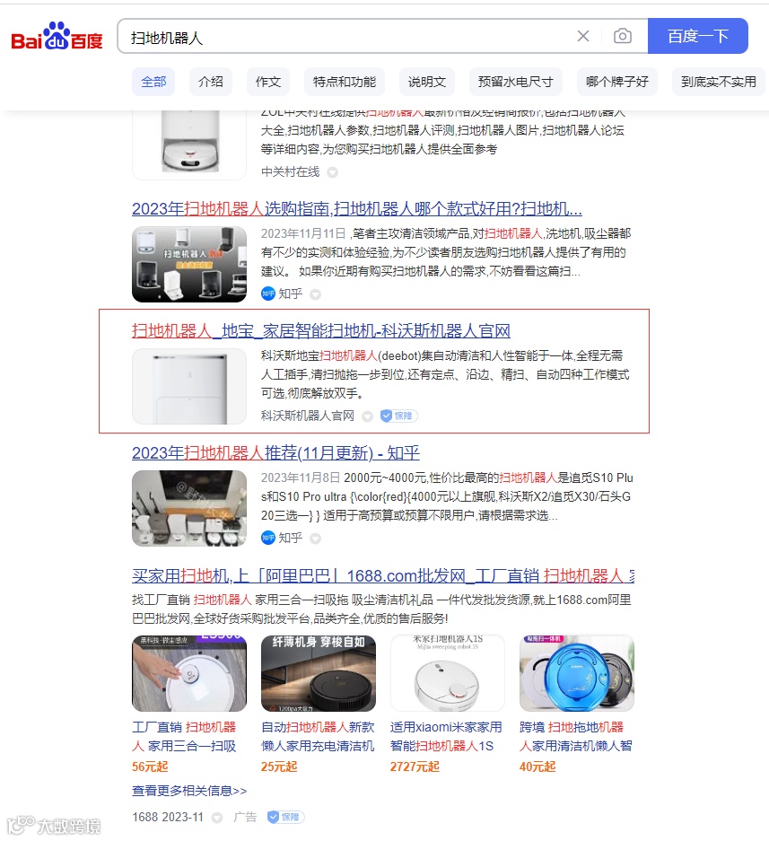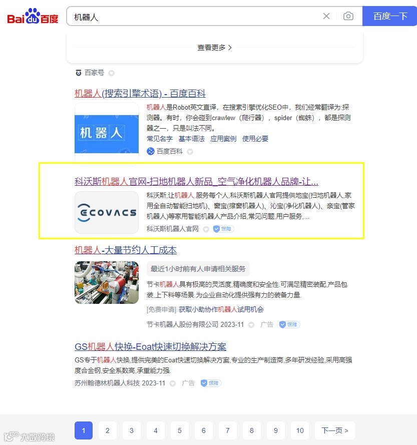 比如“扫地机”、“机器人”这两个词,我们刚开始优化时,搜索结果前五页直接是0个企业官网。位置被京东、天猫、爱采购、新闻平台等电商巨头完全垄断。但最终,我们依然将官网挤入了前十。