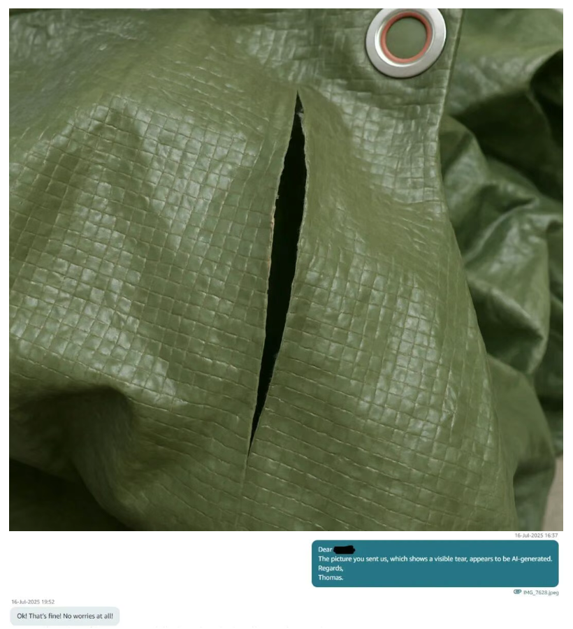 为增强欺骗性,当前诈骗者还会附上伪造的“产品损坏照片”,试图利用视觉证据冲击卖家的心理防线。