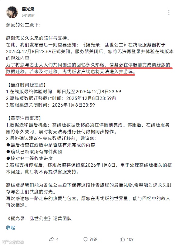 6、《摇光录:乱世公主》游戏正式停运,已经推出离线版本