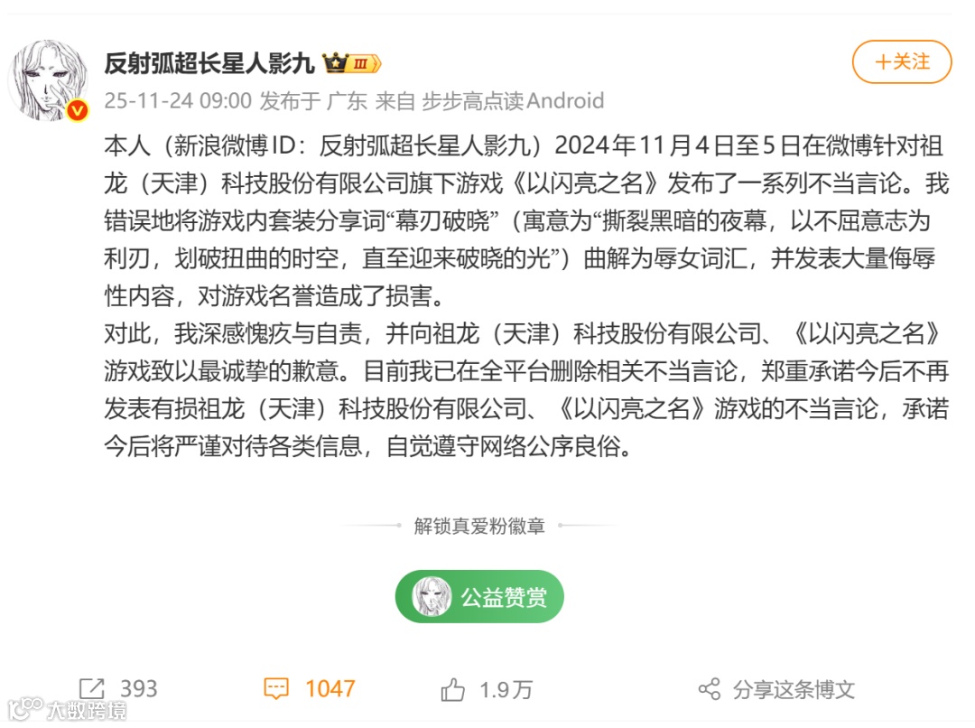 5、微博动漫大V因曲解游戏“幕刃破晓”为辱女词汇,向祖龙《以闪亮之名》公开道歉