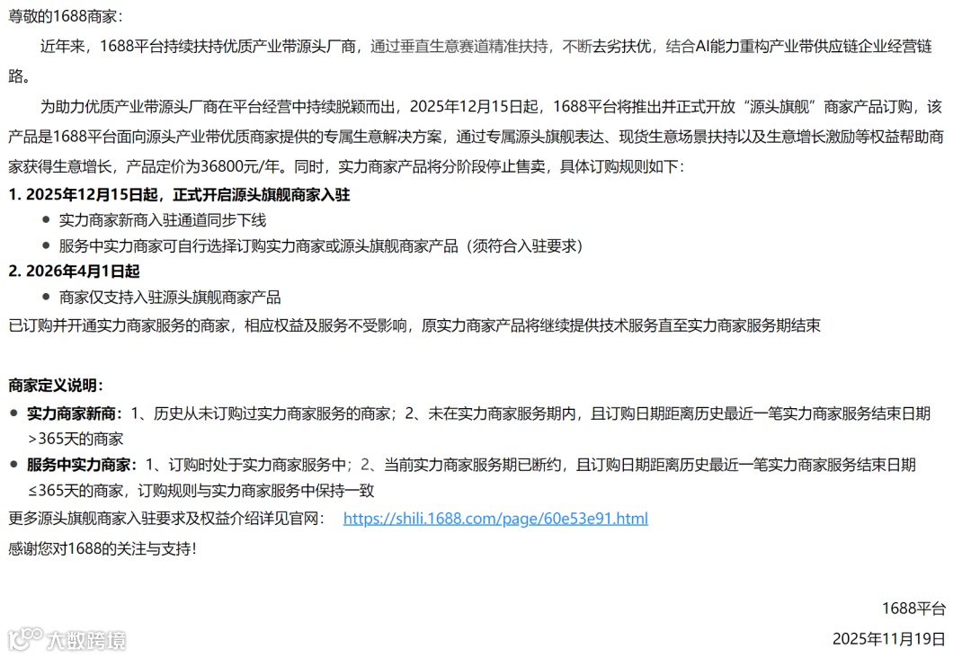 自2025年12月15日起,1688平台将正式推出“源头旗舰”商家产品,定位为面向产业带优质源头厂家的专属成长方案。该产品提供品牌专属展示、现货场景扶持及增长激励等权益,年费定价为36,800元。原“实力商家”服务将同步停止售卖,标志着平台服务向更高层级升级。