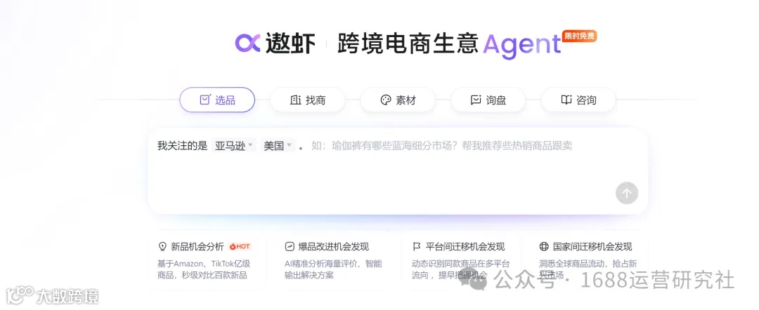 1688正式发布首款面向跨境场景的AI工具——“遨虾”,集成智能选品、供需匹配、供应链推荐等功能,助力跨境卖家高效对接优质工厂资源。该工具旨在降低跨境采购门槛,提升撮合效率,推动B2B数字化进程。