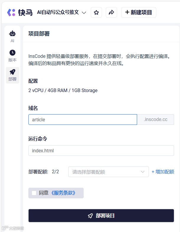 如果觉得效果比较满意,而且想经常使用,可以点击左边侧栏的“部署”按钮,填写自定义的域名后设置可以使用配额,就可以将你的个人AI写作助手部署上线了,这样就可以通过域名链接分享给团队成员使用,或者嵌入到你自己的网站中啦!