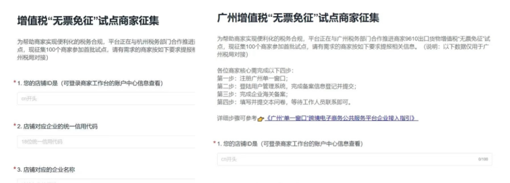 早在深圳之前,速卖通已联合广州、杭州两地税务部门推进了"无票免征"试点,每个城市首批征集100家商家参与。参与试点的平台商家,需要接入广州“单一窗口”跨境电子商务公共服务平台。
