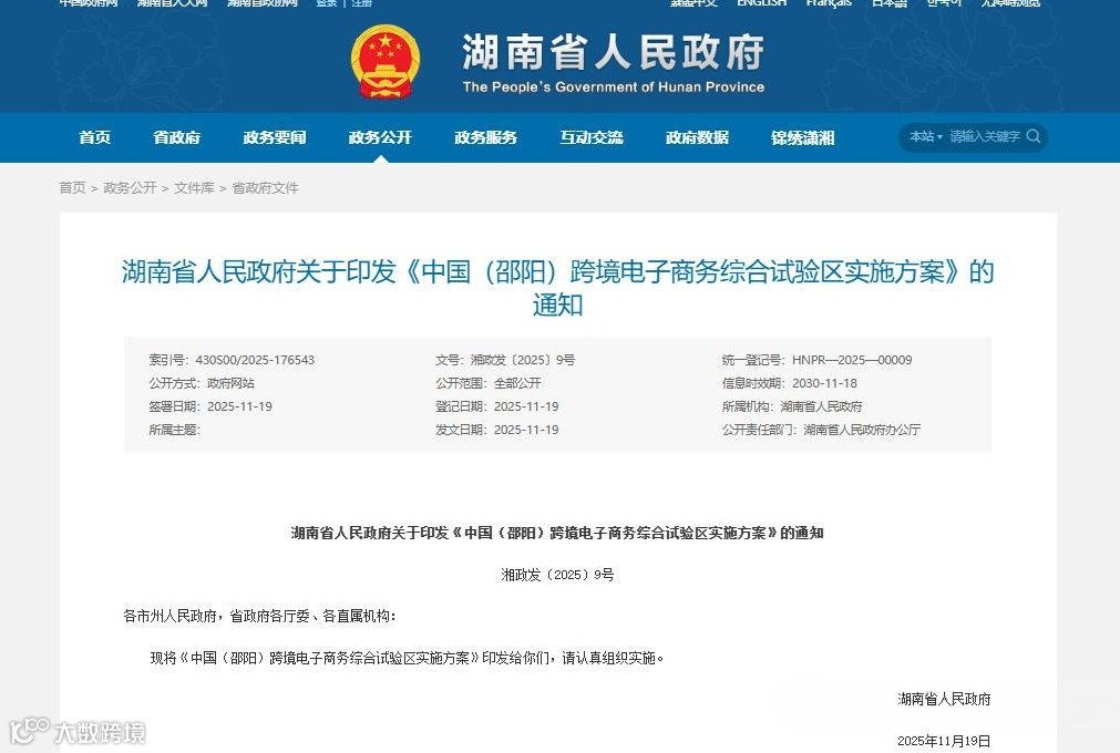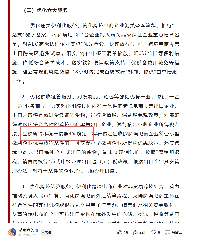 继深圳之后,湖南省通过《中国(邵阳)跨境电子商务综合试验区实施方案》,也推出更具针对性的税收支持政策。
