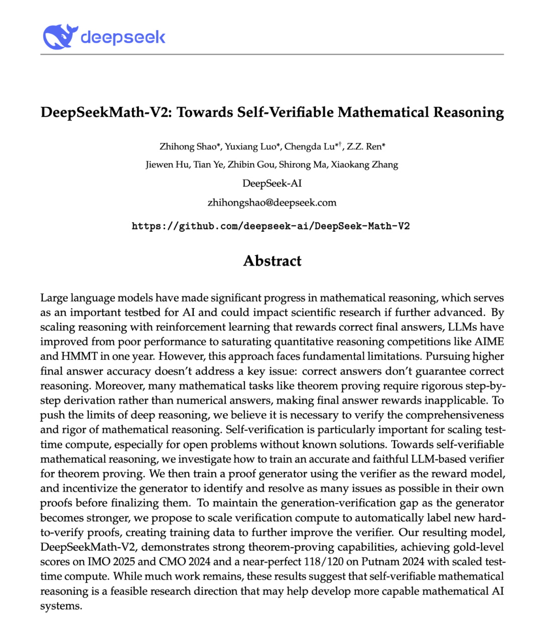DeepSeek-Math-V2 展现了极强的定理证明能力,达到了金牌选手的得分线。