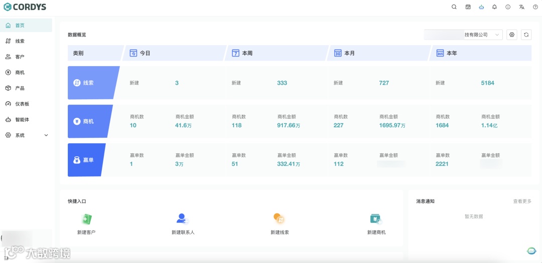 CordysCRM 融合 DataEase 与 SQLBot 的强大能力,对一销售数据进行可视化呈现、进行自助分析。