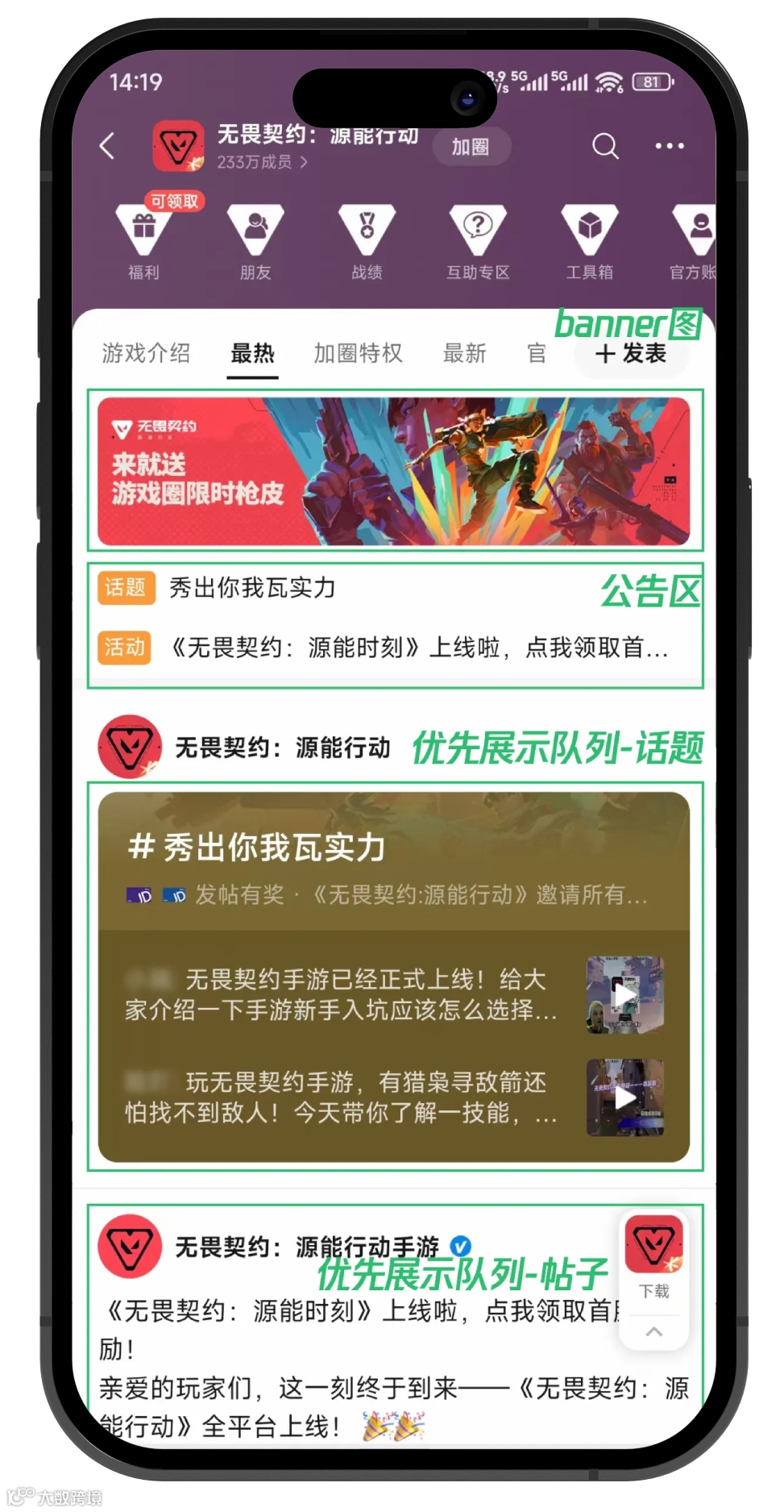通过“最热”Tab页的Banner图(可跳转至有奖话题)、公告区引流、内容加热和优质内容推广等方式,持续维持玩家的活跃度和内容曝光。