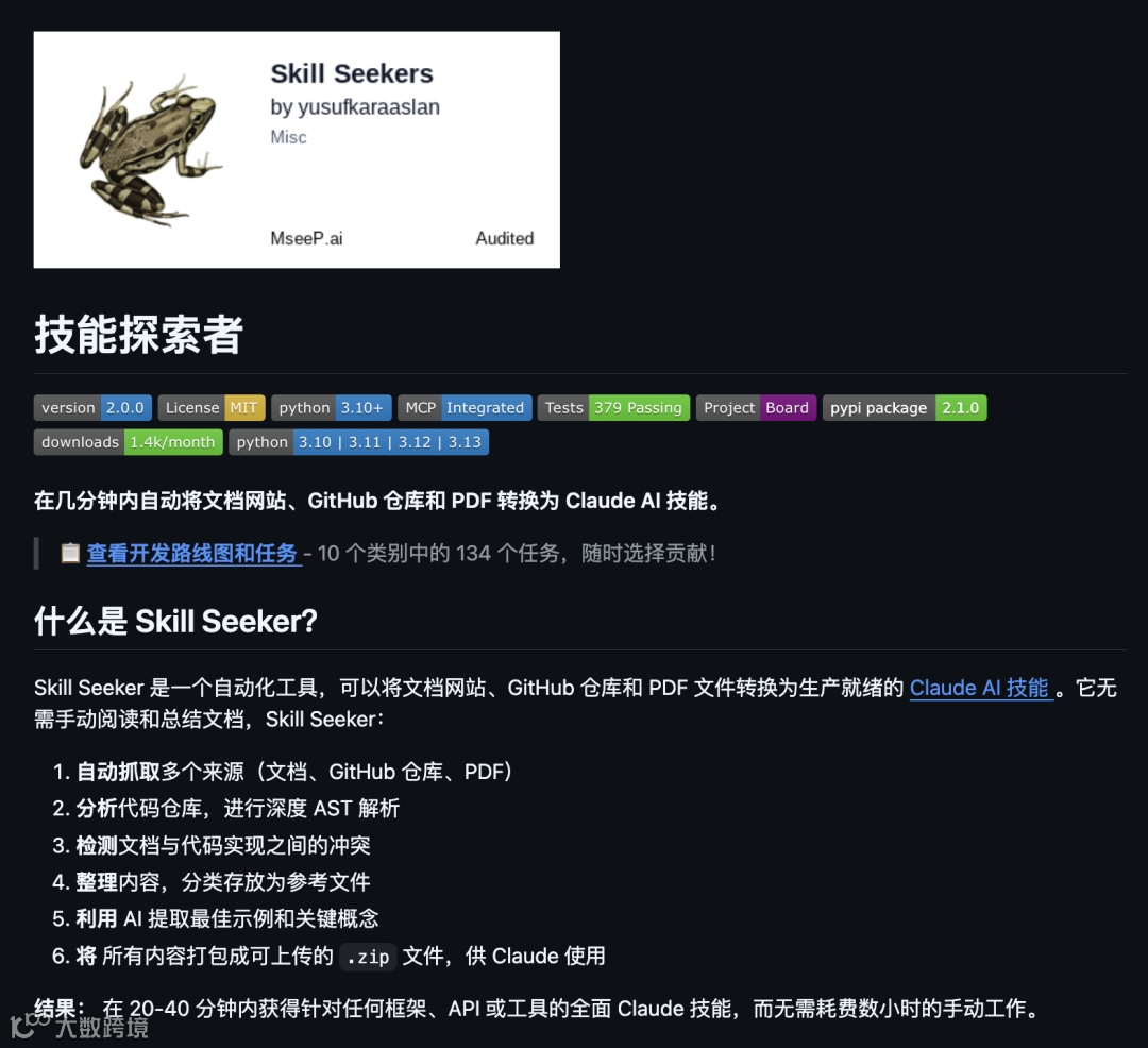 它其实是一个自动化工具,可以把文档网站、GitHub 项目和 PDF 文件转换为 Claude AI Skill 。