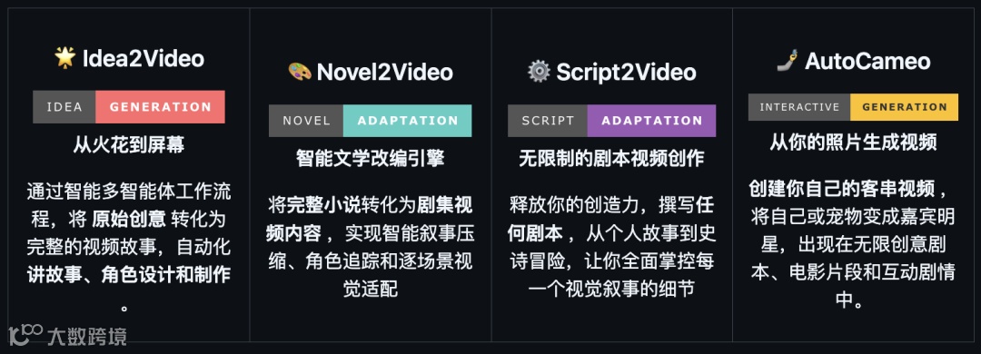 它是一个多智能体视频生成框架,它把视频创作分解为多个专业化 AI 智能体协同工作。能够自动处理脚本编写、故事设计、角色创建和最终视频生成的全过程。