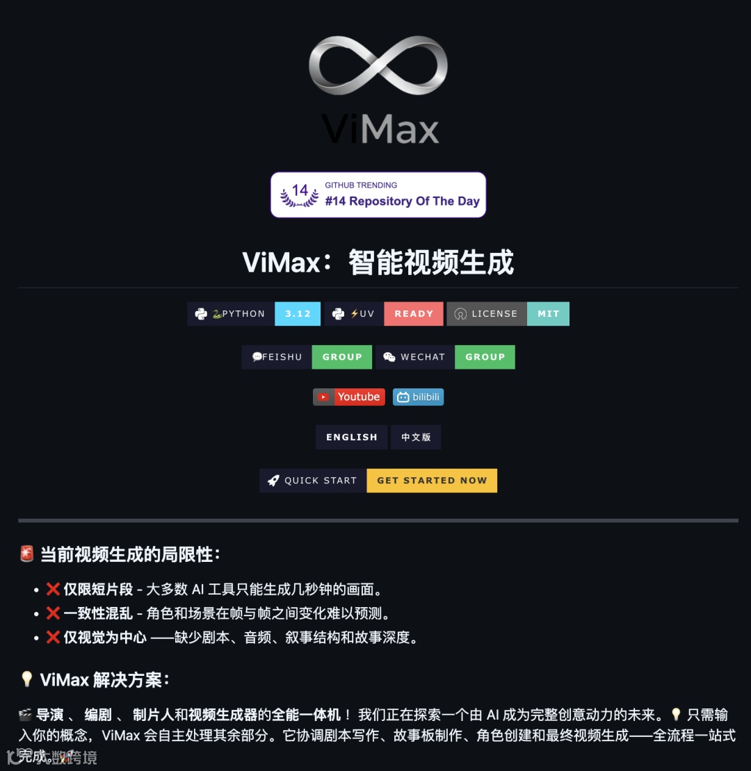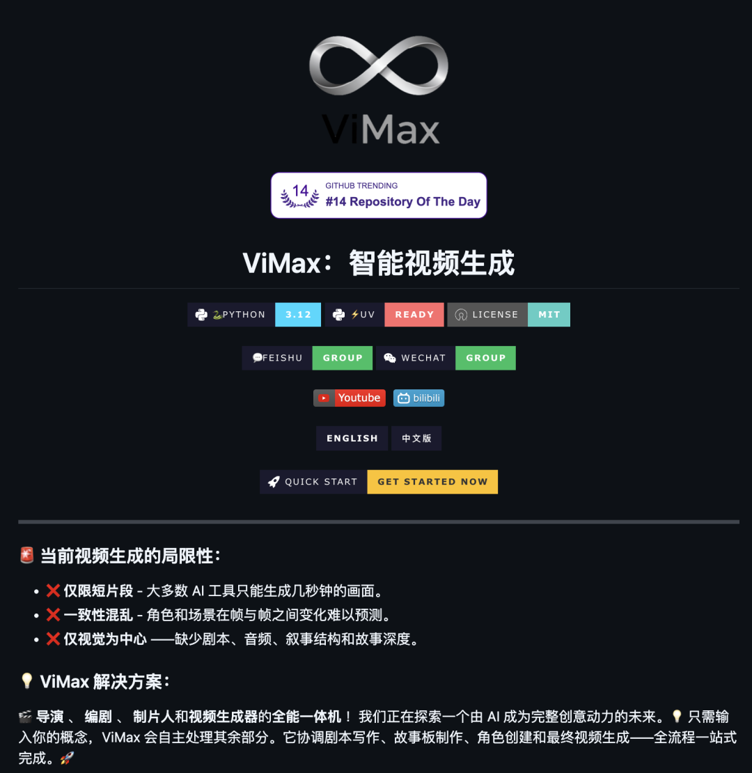 ViMax 将导演、编剧、制片人和视频生成器融合于一体,实现了从概念到成片的端到端自动化视频创作。