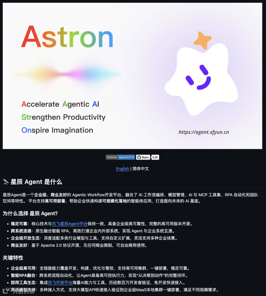 是科大讯飞开源了一个 AI 智能体平台,叫做 Astron Agent ,实用性较高。